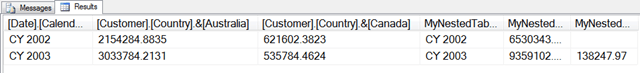 4. Chris – you can use the following query to get similar results. The drawback is that for each member on 0, a calculated member needs to be createdwithmember Australia as Aggregate([Customer].[Country].&[Australia], [Measures].[Internet Sales Amount])member Bikes asAggregate([Product].[Category].&[1], [Measures].[Internet Sales Amount])select {Australia, Bikes} on 0, {[Date].[Calendar Year].&[2002],[Date].[Calendar Year].&[2003]} ON 1FROM [Adventure Works]