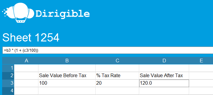 Contains an example of a tax calculation, with three cells: the value before tax, the tax rate, and the value after tax.