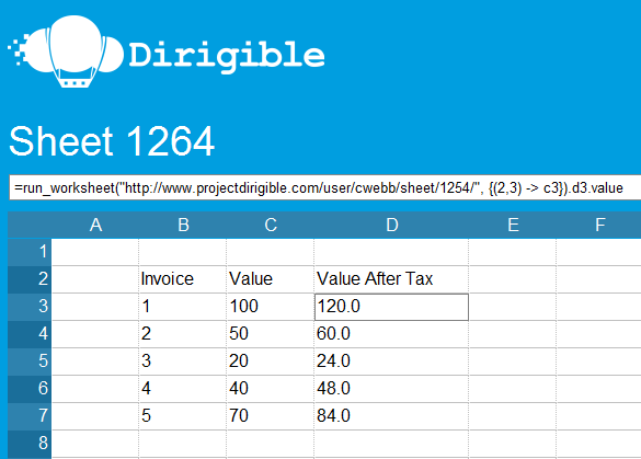 This second sheet then contains a number of sales records and calls the first sheet to calculate the value for each of the sales after tax: