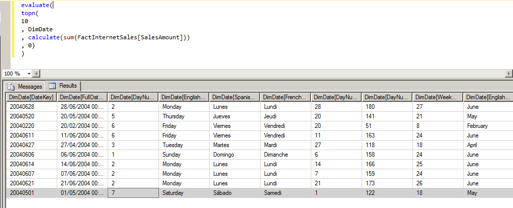 Rob Collie (or rather David Hager, writing on Rob Collie’s blog) recently posted a detailed explanation of how to use the new DAX TopN() function inside a calculation; I assume, however, that’s it going to be more commonly used inside queries. Here’s a simple example that returns the top 10 rows from DimDate by the sum of Sales Amount: