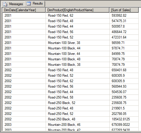 The Generate() function iterates through every row in the table returned by values(DimDate[CalendarYear]) and evaluates the TopN() call in the context of each row; it then unions each top 10 together. In the main query I’m also using the Filter function to remove all the rows returned where there were no sales, just to make the results look tidier. The GenerateAll() function does pretty much the same as the Generate() function, but it will return a row containing null values in situations where the second parameter (in this case, the call to TopN) returns a table with no rows. Last of all, I’m using the AddColumns() function to ensure that the Sum Of Sales is added on to the resultset, and also using the Order By clause to ensure that the rows are returned in a meaningful order.