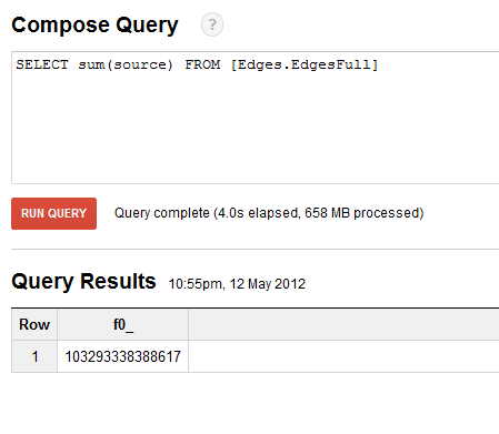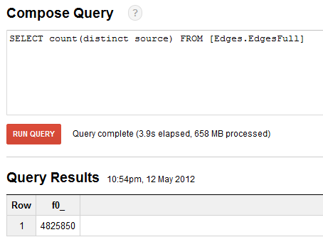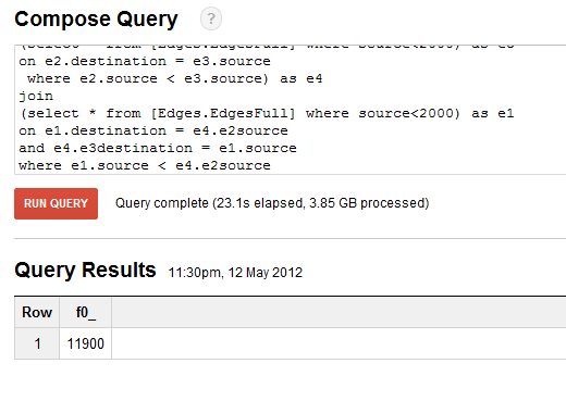 Ignoring the my-technology-is-better-than-yours tone of this post, I thought this was an interesting problem: easy to understand but difficult to calculate quickly, and a good test for any product with pretensions to being a ‘big data’ platform. The two columns in the csv file are meant to represent the ids of members of a social network, and with each row representing a relationship between two people. The problem to solve is to find how many ‘triangles’ there are in the data, ie situations where person A has a relationship with person B, person B has a relationship with person C and person C also has a relationship with person A.