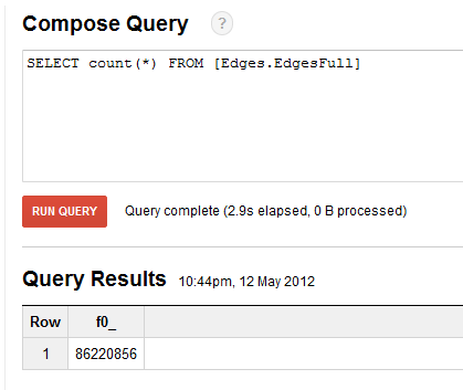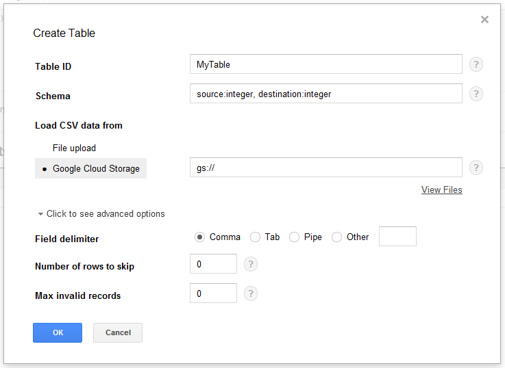 To test it out I thought I’d see how it handled the largest csv file I happened to have handy: a 1.2 GB dataset consisting of two integer columns and 86,220,856 rows. I wasn’t able to load the file direct into BigQuery because it was too large (small files you can load in direct), so I first had to upload it into Google Cloud Storage and then loaded it into BigQuery. The upload into Google Cloud Storage took about an hour, and once that was complete it took about 15 minutes to load it into BigQuery. Here’s the dialog for loading data into BigQuery – it’s pretty straightforward, as you can see: