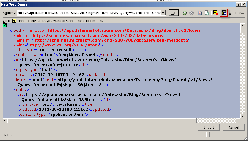 This is ugly, and indeed Excel has the ability to import XML returned from a Web Query as XML – but what I’ve found is that if you don’t use the approach I’m showing here, you won’t be able to refresh you query properly.