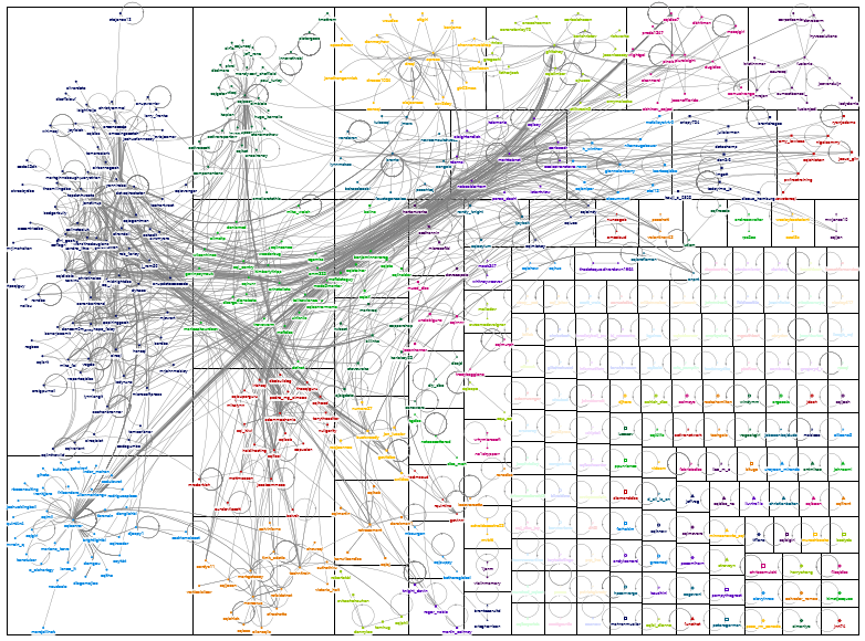 In NodeXL I imported 1757 tweets from 515 different people that included the #sqlpass hashtag from the 8th of November when Twitter activity at the conference was at its peak (I couldn’t import any more than that – I assume Twitter imposes a limit on the number of search results it returns). In basic terms, when NodeXL imports data from Twitter each Twitter handle becomes a point on a graph, and a line is drawn between two Twitter handles when they appear in a tweet together. I won’t bother going into any detail about how I built my graph because analysing the results is much more interesting, so I’ll just say that after playing around with the clustering, layout and grouping options here’s what I came up with: