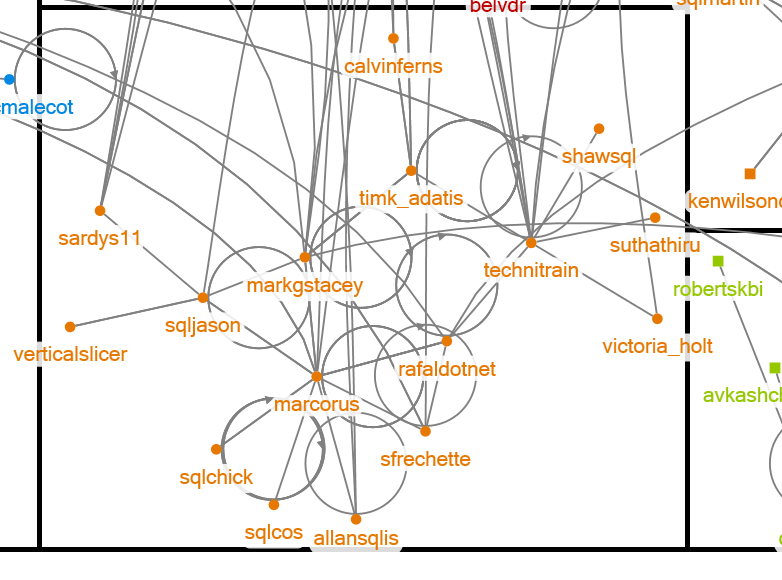 It looks very pretty from this distance but it’s not very useful if you can’t read the names, so I saved a much larger .png version of this image here for you to download and explore, and if you’ve got NodeXL you can download the original workbook here (don’t bother trying to open it in the Excel Web App). It’s fascinating to look at – even though the data comes from a very restricted time period the cliques in the SQL Server world emerge quite clearly. For example, here’s the group that the clustering algorithm has put me in  (I’m @Technitrain), which is at the bottom of the graph on the left-hand side: