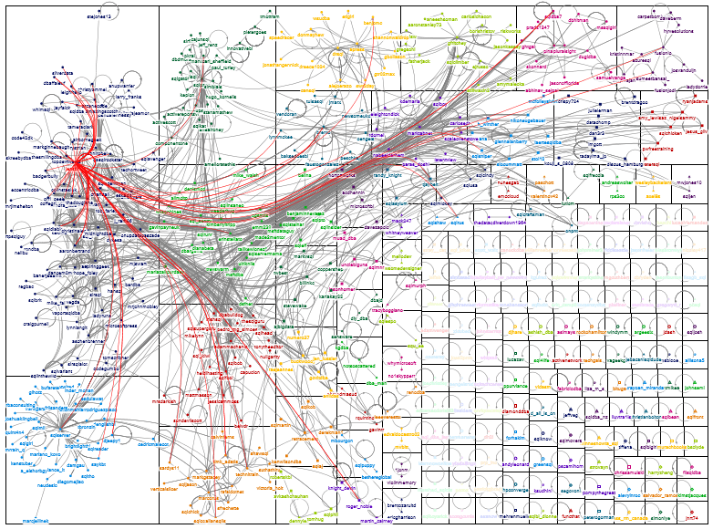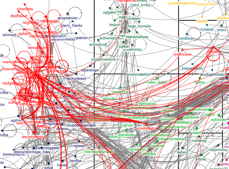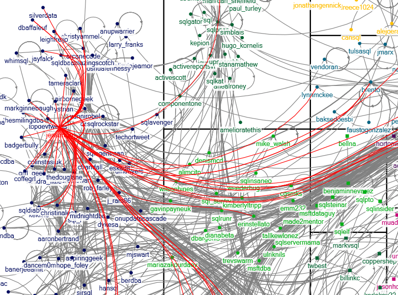 There’s a very strong UK/SQLBits presence there (@timk_adatis and @allansqlis for example), but also a strong BI presence as well with @marcorus and @markgstacey, which is pretty much what you’d expect. There are several other small groups like this, plus a large number of unconnected people in groups on their own in the bottom right-hand corner of the graph, but on the top left-hand side there’s a monster group containing a lot of well-known SQL Server personalities. Jen Stirrup (@jenstirrup) is right in the centre of it, partly because she’s one of the SQL Server Twitter royalty and partly because of her well-deserved PASSion award that day. Highlighting in red just the tweets that involved her shows at the very highest level how well-connected she is: