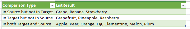 Fairly self-explanatory, I think. List.Difference() finds the items that are in one list and not another: List.Intersect() finds items that are in both. In fact it’s probably more interesting to look at how I’ve generated the output. Table.FromRows() returns a manually constructed table. The CombineWithComma step uses Combine.CombineTextByDelimiter() to return a function that turns all of the items in a list into a single, comma-delimited piece of text, and I then use that function inside each row of the table I’m returning to get a readable version of what List.Difference() and List.Intersect() return.