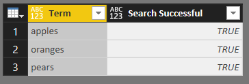 - Adding a custom column to the table returned by the first step, and calling the function defined in the second step using the search term given in each row.