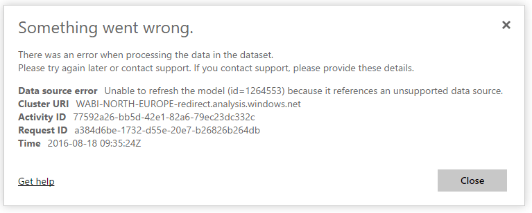 UPDATE #2: since writing this post the error message you’ll get in the Power BI Service has changed to this: You can’t schedule refresh for this dataset because the following data sources currently don’t support refresh The problem and the solution are exactly the same though.