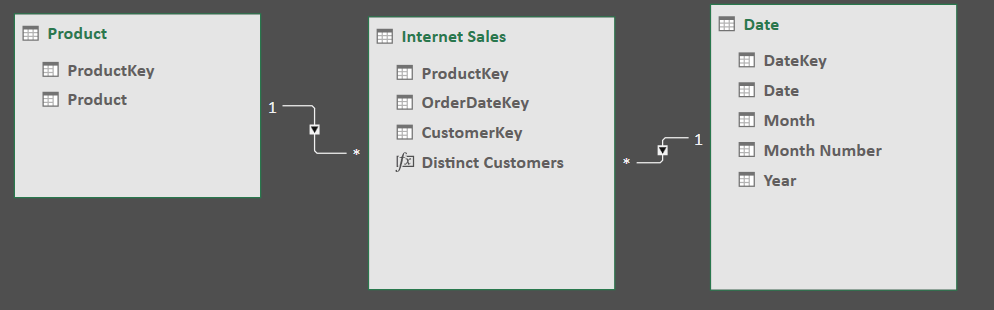 The Internet Sales table contains one row per sales transaction; Product and Date are dimension tables that provide more information on the product bought in the transaction and the date the order was taken on. There’s one measure called Distinct Customers that returns the distinct count of customers; its definition is as follows:
