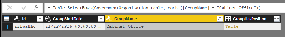 Altering the query to filter the rows down to where the GroupName column equals “Cabinet Office” like so: