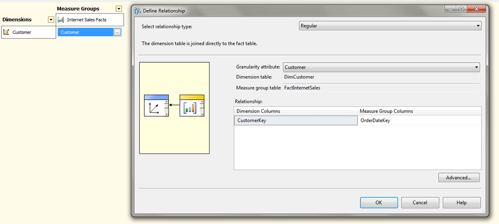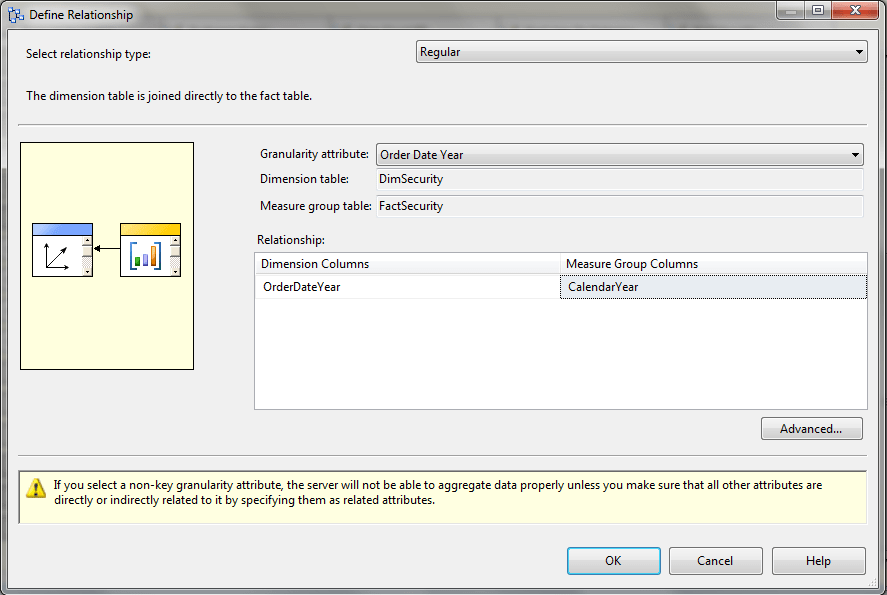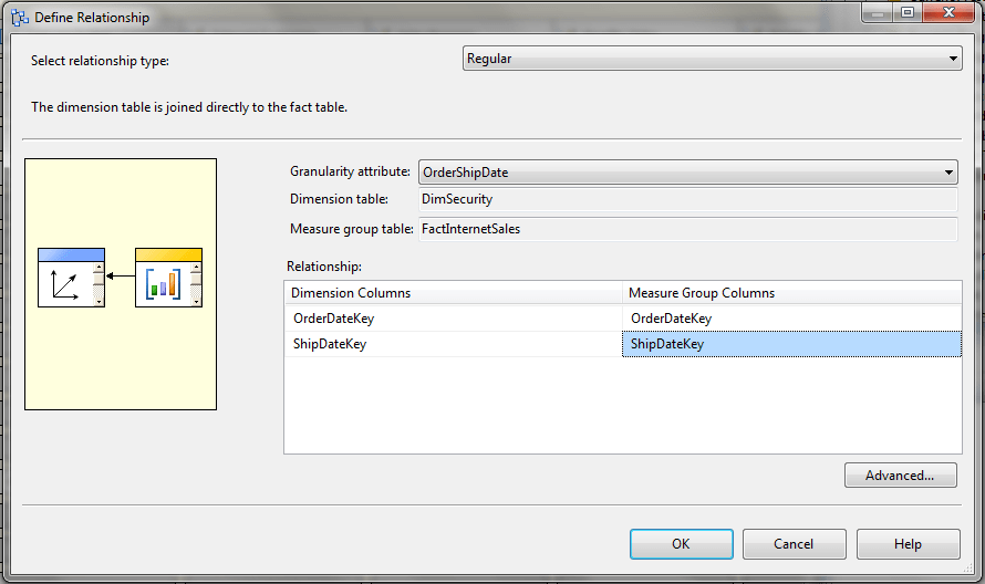 This will be our factless fact table that grants a user access to the year 2003. Then build a new dimension called User from the UName column to give you a dimension containing all your users, as you would in any normal dynamic security implementation; also build a new measure group in the Adventure Works cube from this table and give it a regular relationship with the User dimension and a regular relationship with the Security dimension at the OrderDateYear granularity: