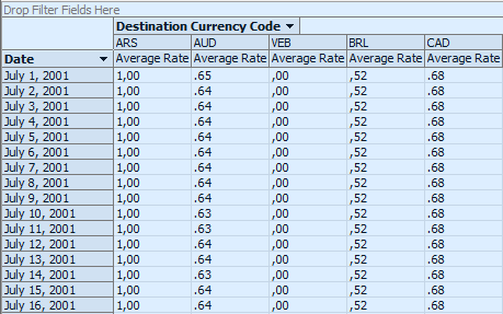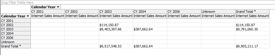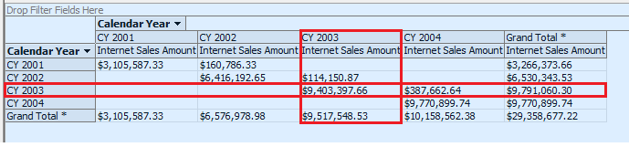 Let me give you an example that I worked on with a customer recently, translated to Adventure Works. The Internet Sales measure group in the Adventure Works cube contains three role-playing dimensions based on the Date dimension: Date (which represents the Order Date), Ship Date and Delivery Date. Let’s imagine that we want to implement dynamic security so that a user can only see data if either the Date or the Ship Date is in one particular year. For example if a user has access to the year 2003 they should be able to see data if the year on the Date dimension was 2003 or if the year on the Ship Date dimension was 2003, as shown in the cells highlighted in the following screenshot (note that the grand totals should also reflect only values from the two 2003 years as well, so on the last row below we should see a grand total of $387662.64 for the CY 2004 column):