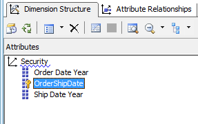 Then create a new role, grant it access to the Adventure Works cube, go to the Dimension Data tab, select the Security dimension and the OrderShipDate attribute and go to the Advanced tab. Then enter the following MDX in the Allowed Member Set box: