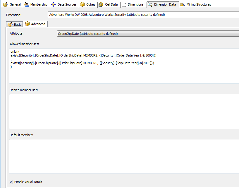 This grants access to all combinations of Order Date and Ship Date – all the members on the OrderShipDate hierarchy – that are either in the Order Date year 2003 or the Ship Date year 2003. Don’t forget to check the Enable Visual Totals box too.