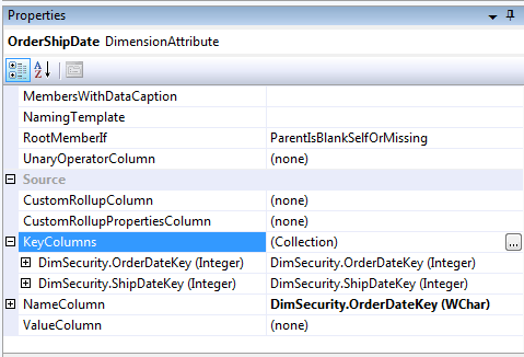 - A key attribute called OrderShipDate that has a composite key based on the OrderDateKey and ShipDateKey columns. I used the OrderDateKey column as the name column, but that’s not too important because this dimension will be hidden anyway. This attribute represents the distinct combination of order date and ship date.